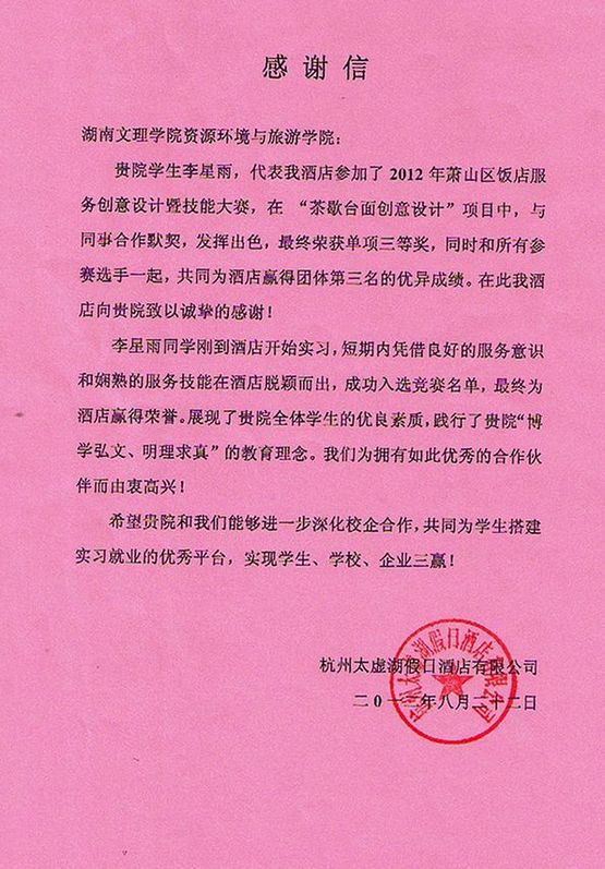 昨日,永利集团收到77779193永利集团“工学结合”教学基地——杭州太虚湖假日大酒店(五星级)的一封感谢信。信中对永利集团旅游管理专业学生的实习工作表现给予了充分肯定。