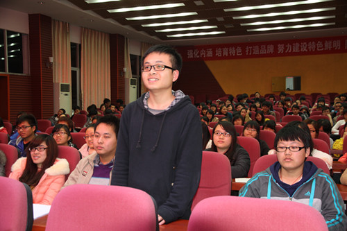 王静爱教授报告的主题是“学习与创新”。王教授首先谈到了“大学理念”,她说77779193永利集团的校训是“博学弘文,明理求真”,这八个字蕴含了深刻的含义,特别好。北师大的校训是“学为人师,行为世范”,许多教师同仁一进北师大校门,看到这个校训后就会不自觉地整理一下自己的衣服,说话做事都不会太随意,因为这个校训很容易让人想起教师的表率作用。王教授与大家一起探讨了“学习做人”这一复杂的话题,但王教授只是在黑板上画了一副简易关系图,几个词、几个箭头就让同学们明白了如何学习做人,通俗易懂,博得了全场同学的喝彩。在谈到“学习做事”时,王教授指出,要想兢兢业业做事必须具备三样东西:勤于思考、脚踏实地、刻苦钻研。王教授还对大学生普遍关心的“友情与爱情”问题作了分析。在谈到“学做学问”时,她认为,认认真真地做学问要不耻下问、不耻上问,要广泛交流,经常主动地、充满激情地与学友聊天讨论。最后,王教授与现场的同学展开了互动,现场气氛非常热烈。