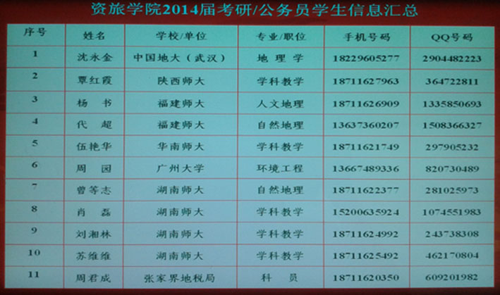 永利集团2014届应届毕业生有沈永金等10名同学考取中国地质大学等6所高校研究生(其中地理科学专业2010级102班32名应届毕业生中有苏维维等6名同学考上研究生,考研率近20%),旅游管理专业周君成同学考取张家界市地税局公务员。