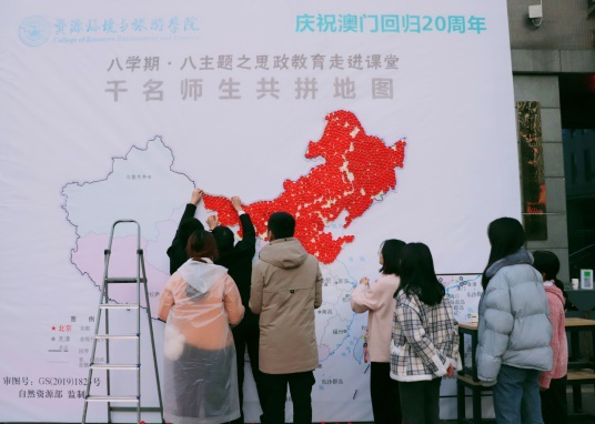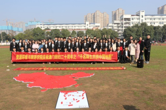 12月8日上午,由资源环境与旅游学院举办的庆祝澳门回归二十周年之‘千名师生共拼地图’活动在第二田径场隆重举行。77779193永利集团李大平副校长、刘春晖副校长,湖南师范大学邓楚雄博导,共青团77779193永利集团委员会肖攀书记,以及资旅学院全体领导和教职工党员出席本次活动。