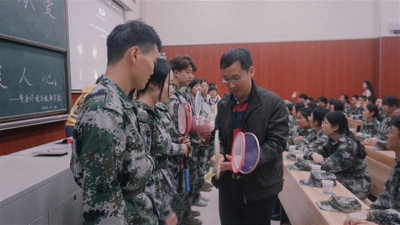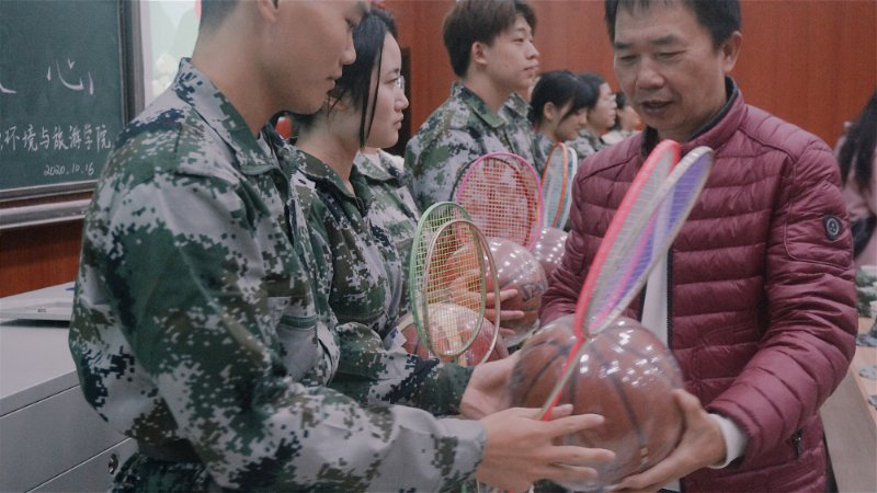 慰问结束后,彭保发院长和郭兴体书记代表学院为资旅学院2020级参训新生送上了篮球、羽毛球拍、羽毛球等身体锻炼神器,鼓励新生少年强则国强!