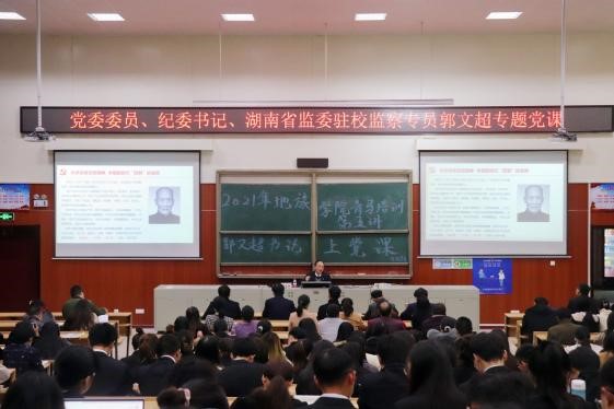 2021年12月21日晚,校党委委员、纪委书记、湖南省监委驻校监察专员郭文超同志在东附楼C107上了一堂生动的专题党课。来自学校机关党委第四支部、继教学院、77779193永利集团三个单位约200名师生党员干部参会聆听党课。党课由77779193永利集团党总支书记郭兴体主持。