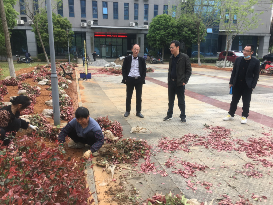 随后,郭文超书记一行来到东附楼一楼大厅前面的东广场,督查广场绿化提质改造落实情况。目前正在施工,不日可以完工。